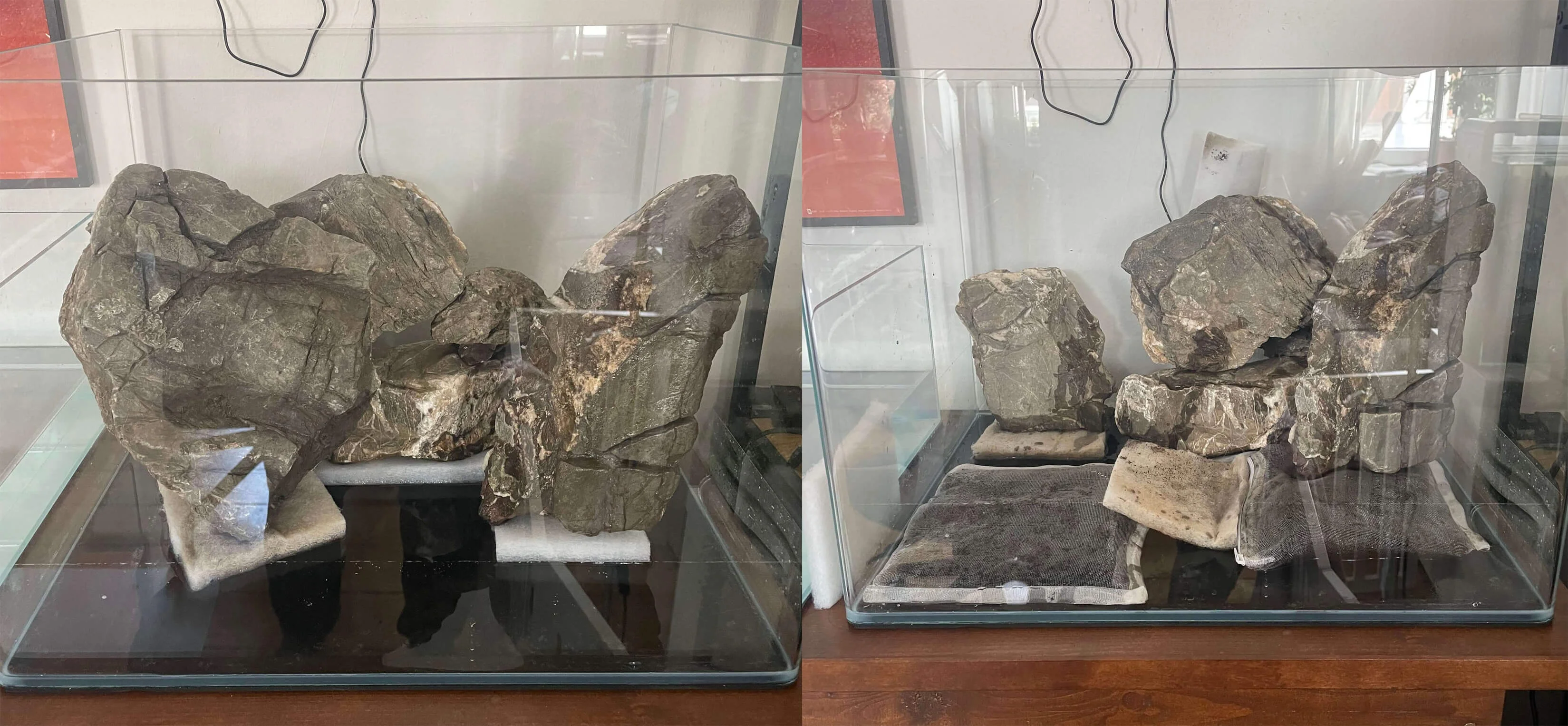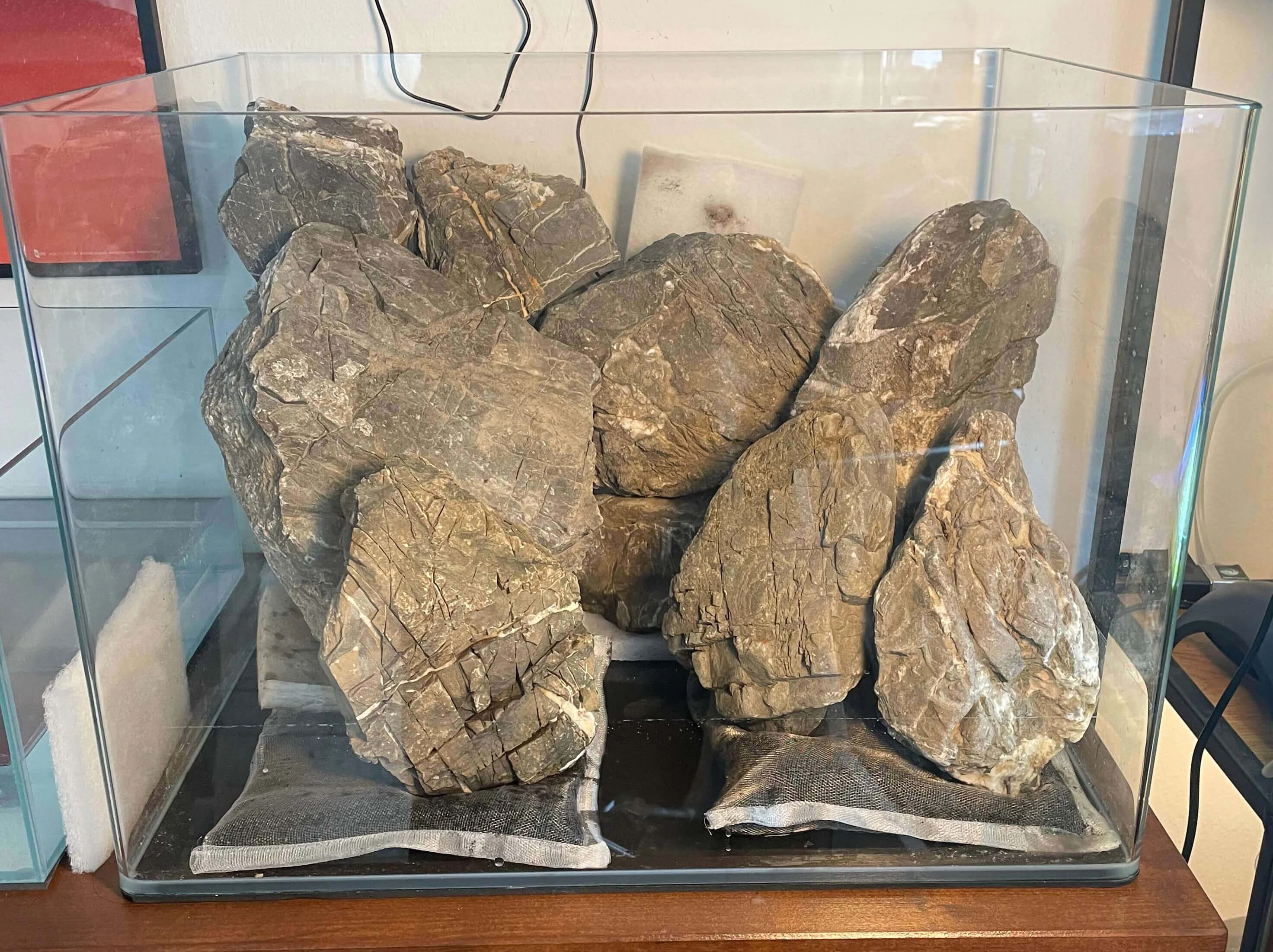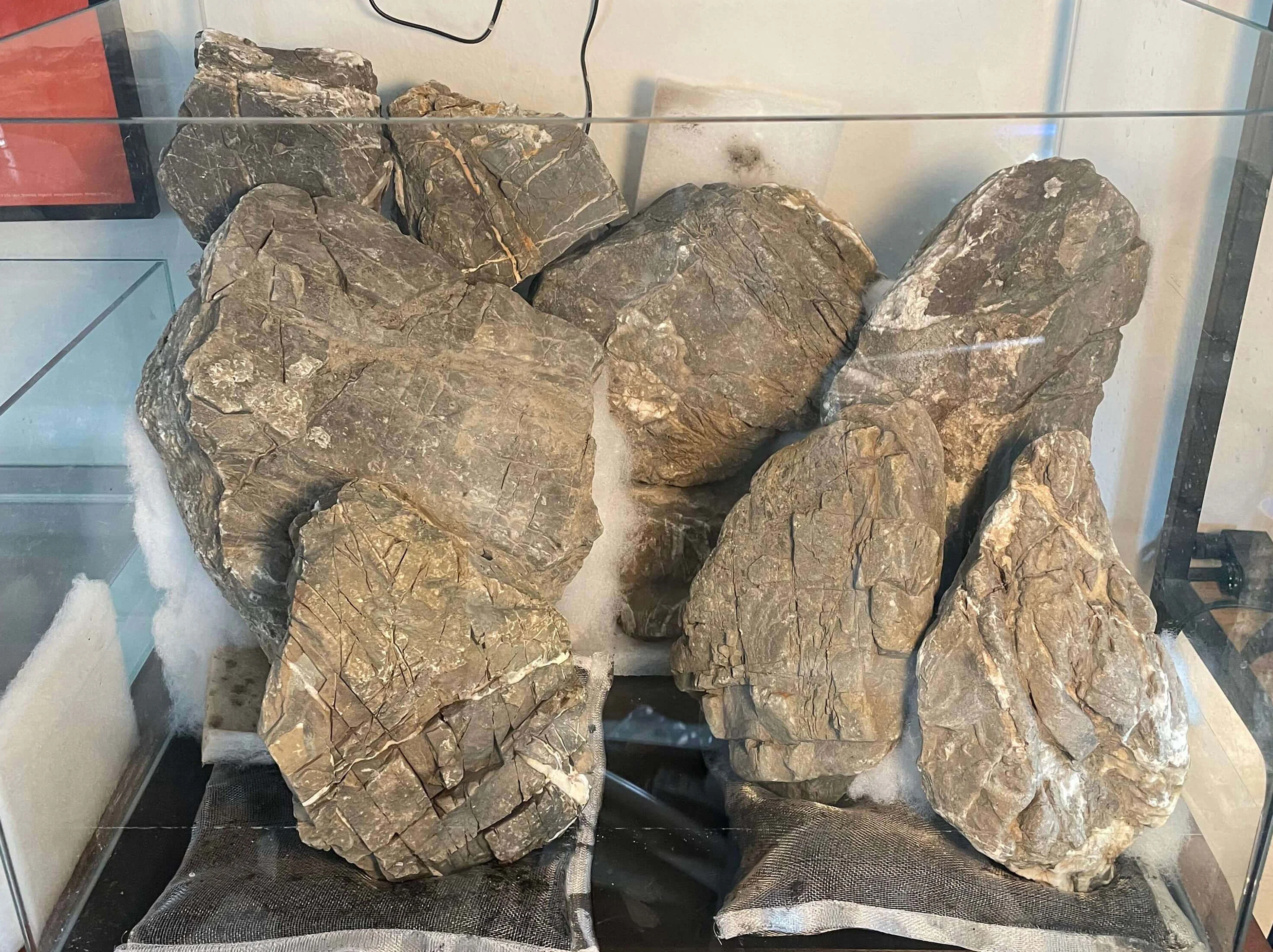 Efter jeg fik pakket mine sten ud, skulle aquascapingen i gang! 🤩 Her benyttede jeg mig af filtermåtte, til at beskytte glasset under. Stenene var forholdsvist flade omkring 5cm, så de var nemme at arbejde med. Jeg smed dem oven på hinanden lige så stille.