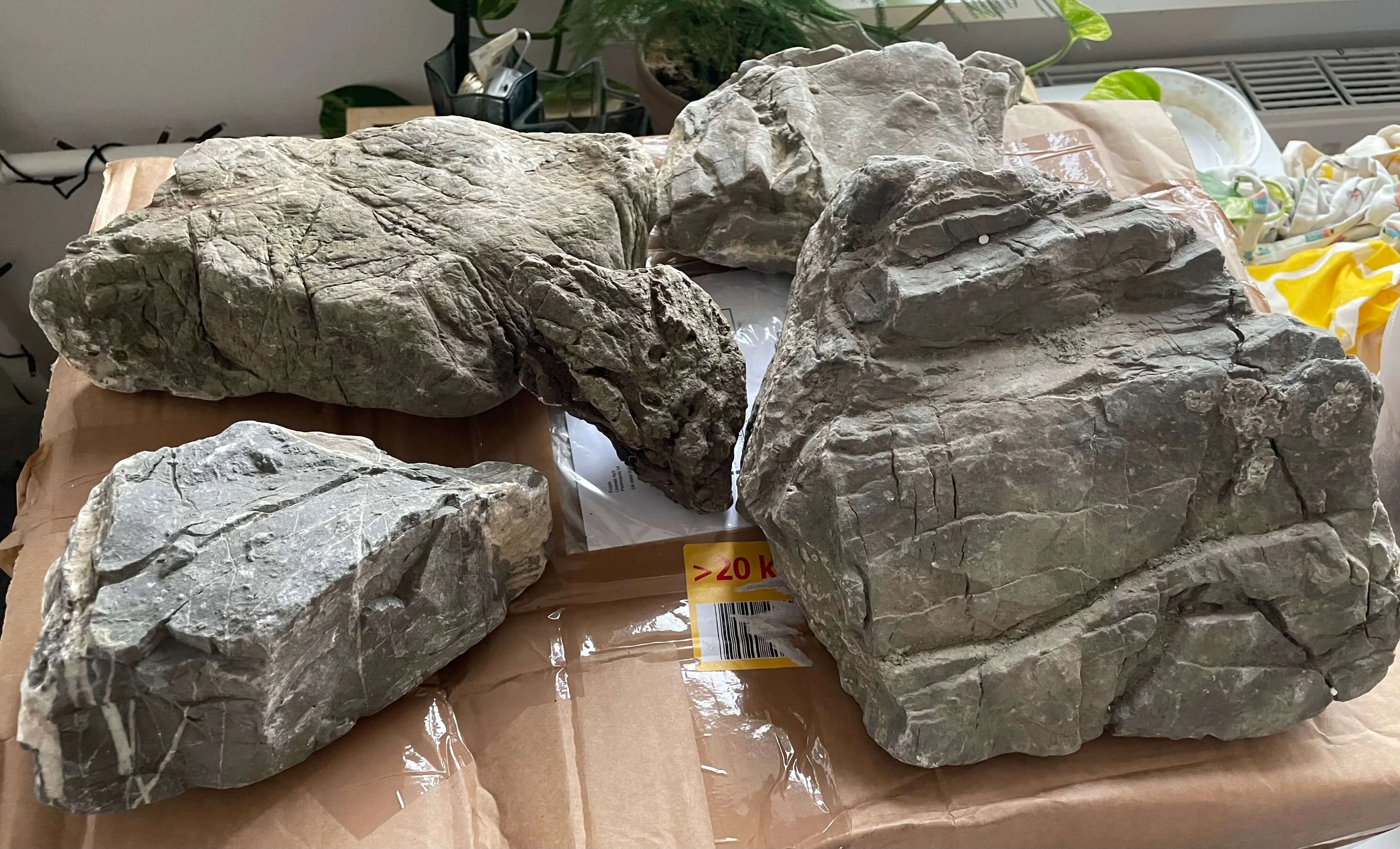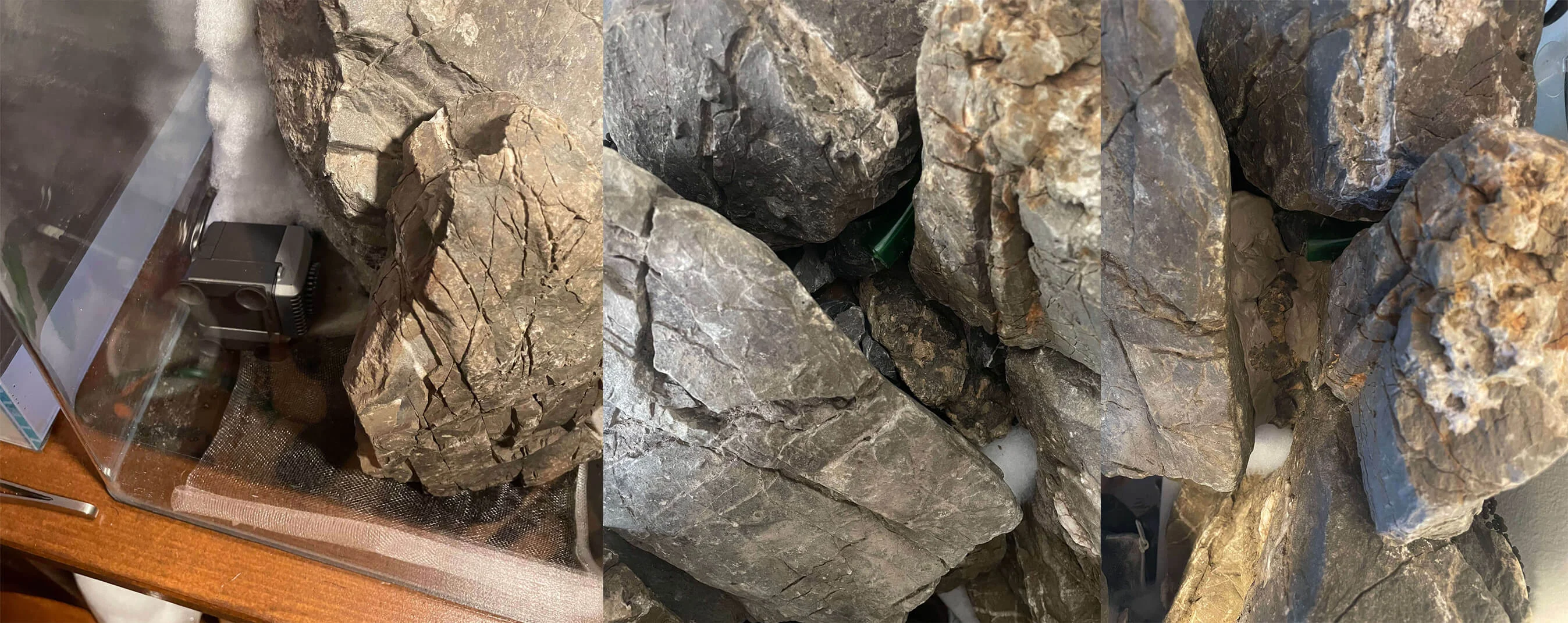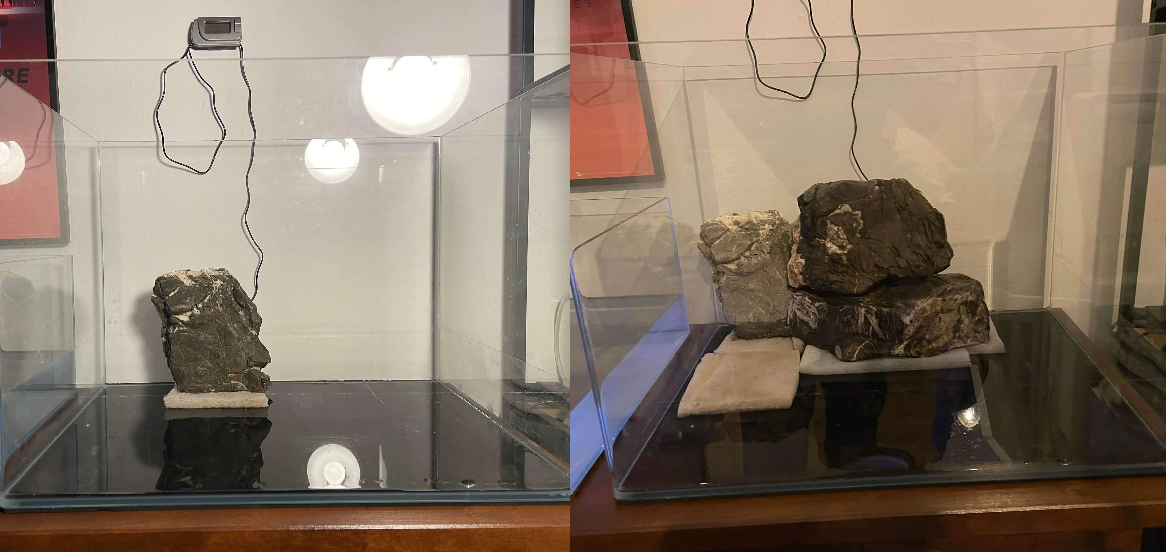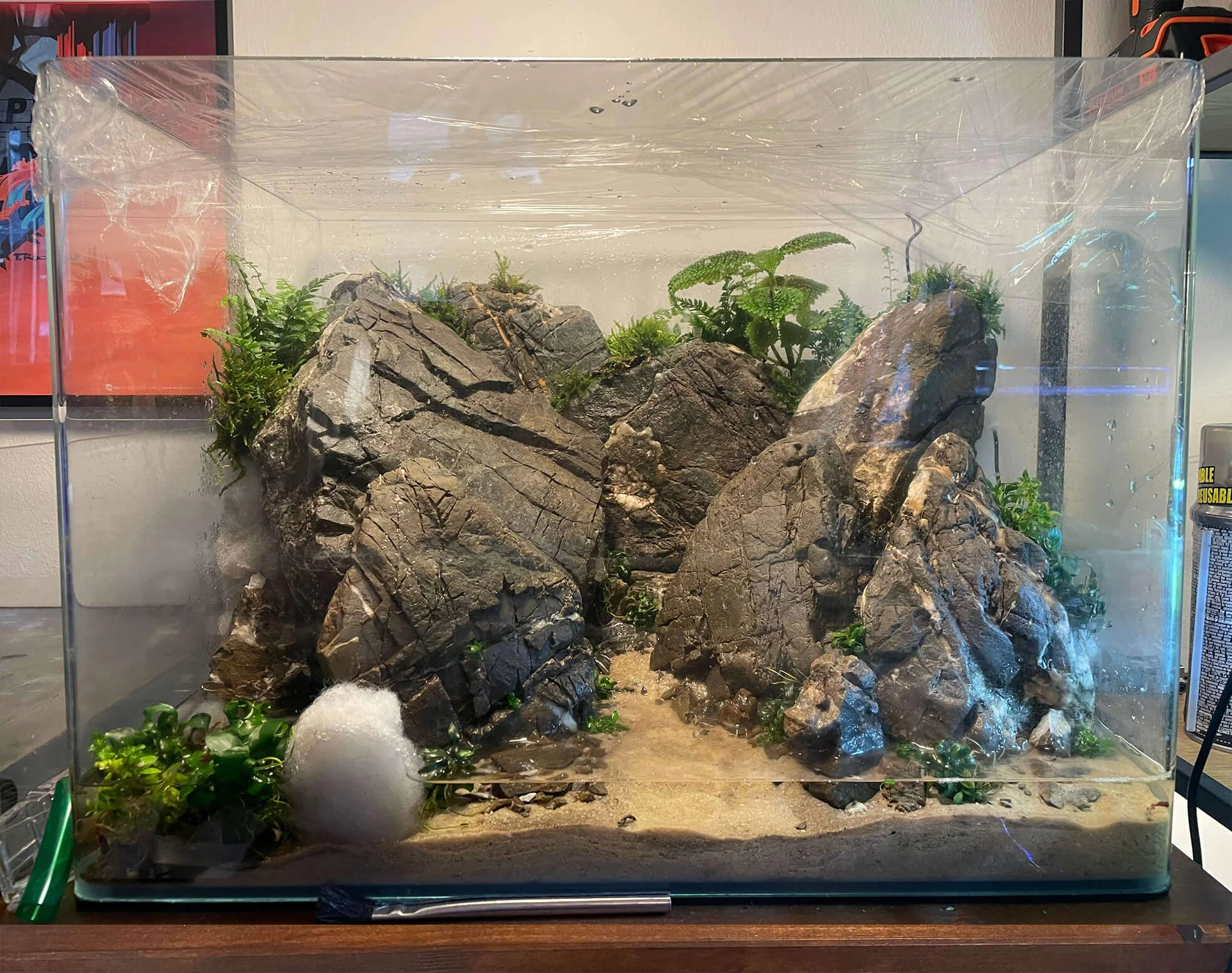 Efter jeg fik pakket mine sten ud, skulle aquascapingen i gang! 🤩 Her benyttede jeg mig af filtermåtte, til at beskytte glasset under. Stenene var forholdsvist flade omkring 5cm, så de var nemme at arbejde med. Jeg smed dem oven på hinanden lige så stille.