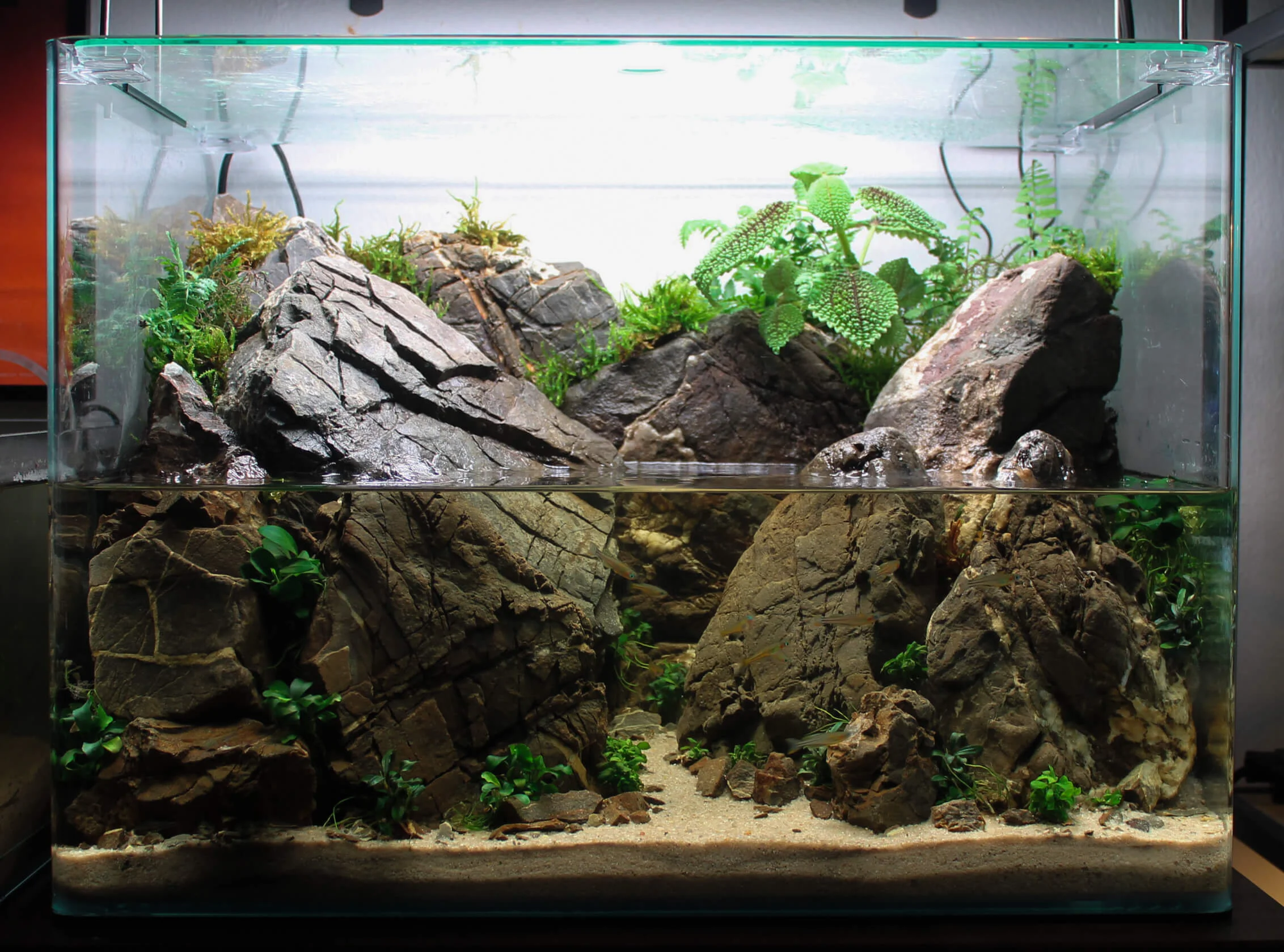 Herfra tilføjede jeg detaljer, som små sten og planterne. Jeg lavede også en dry start på akvariet de første 2 uger, det gjorde at planterne hang fast efterhånden som jeg fyldte mere vand i akvariet. Jeg var dog ikke helt færdig endnu, fordi jeg skulle skjule en masse filtervat! 😫 Det skal siges at jeg begyndte på at gøde akvariet med flydende gødning og ghostfeed herfra.