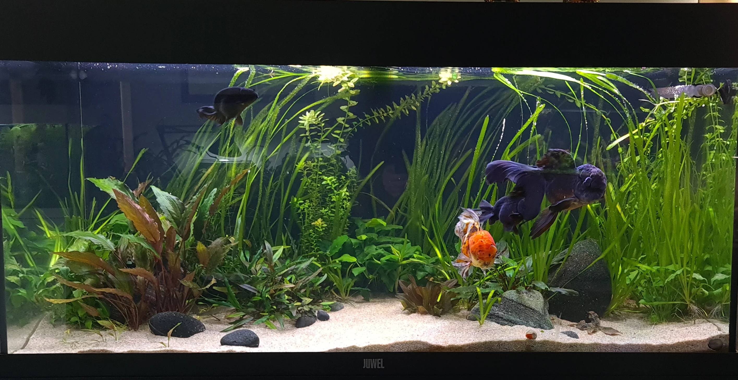Jeg har også et 180L slørhale akvarie, slørhalerne var faktisk i 350L akvariet, men det var ikke helt optimalt da akvariet er 60cm dybt og de skulle kæmpe for at nå bunden. Efter de er flyttet over i et lavere akvarie går det meget bedre.
