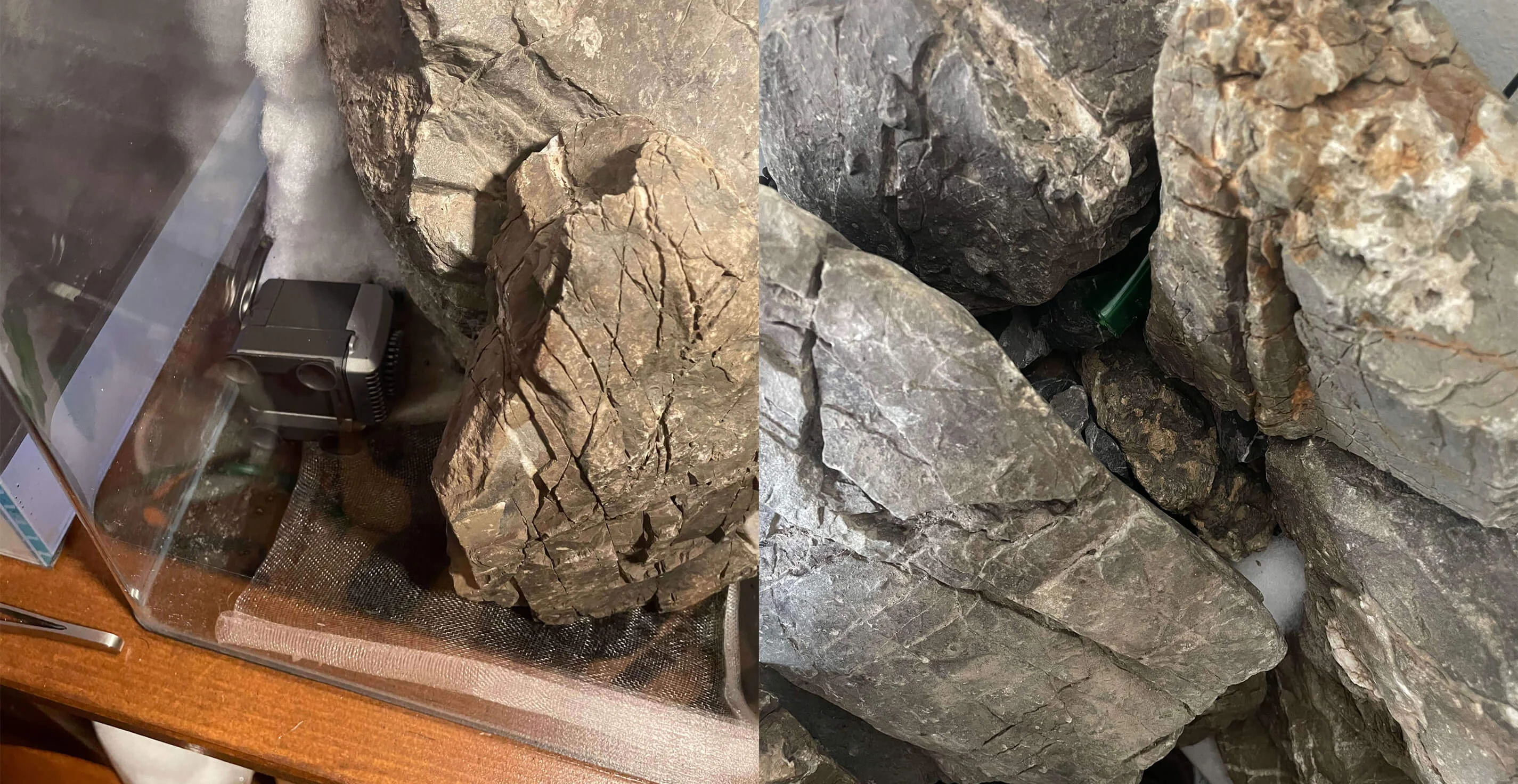 Efter jeg fik pakket mine sten ud, skulle aquascapingen i gang! 🤩 Her benyttede jeg mig af filtermåtte, til at beskytte glasset under. Stenene var forholdsvist flade omkring 5cm, så de var nemme at arbejde med. Jeg smed dem oven på hinanden lige så stille.